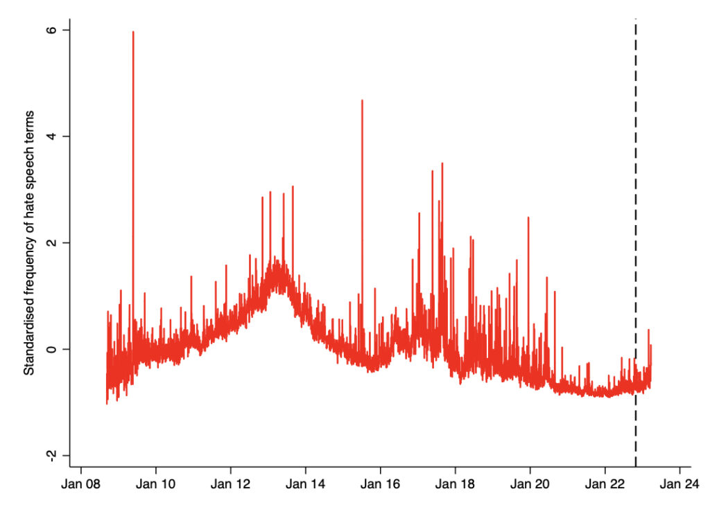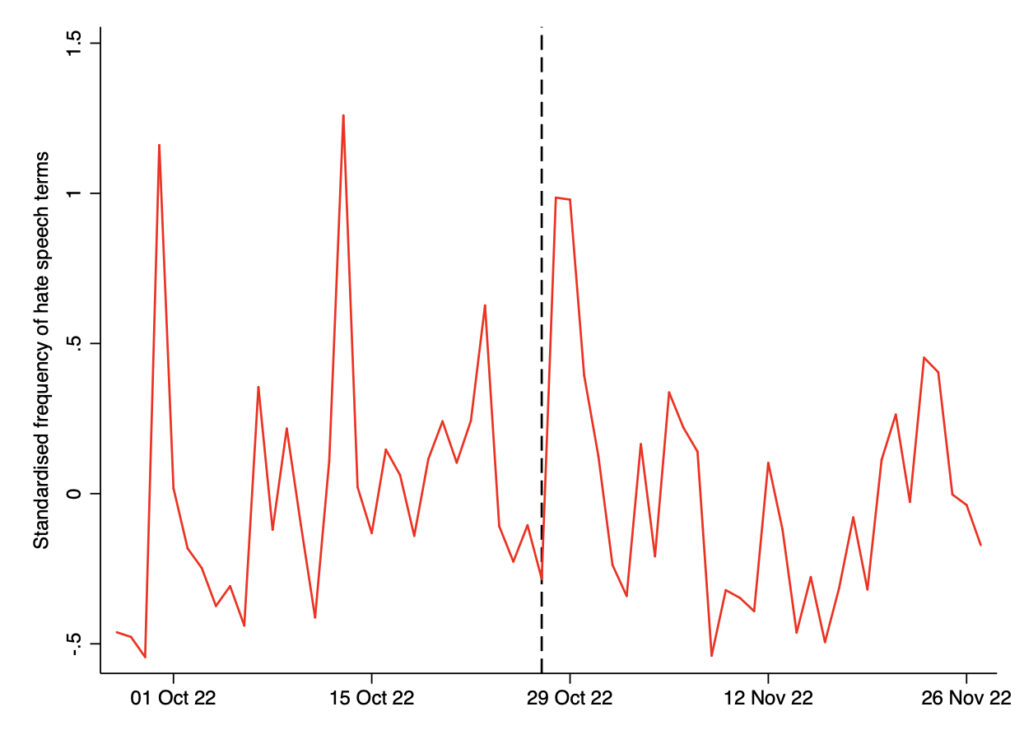 As Yoel Roth, Twitter’s former head of “Trust and Safety”, notes, a trolling campaign began shortly after the takeover was announced, whereby various accounts posted irreverent tweets to test whether they could use racial slurs. Many of these accounts were removed, which may help to explain why there was no sustained rise in the usage of such words.