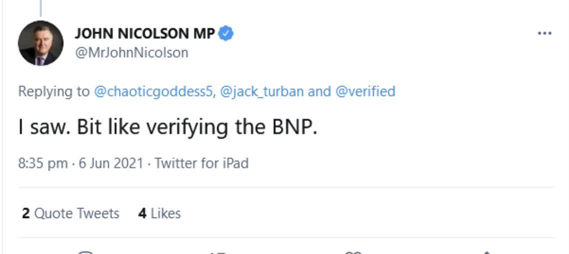 Then out of the woodwork stumbled John Nicolson. Nicolson is the SNP MP Ochil and South Perthshire and an outspoken critic of the LGB Alliance, which he has described as “nasty” and “sinister“. Last night he jumped onto Turban’s Tweet and compared the group to the BNP, which he has since deleted (screenshot below).