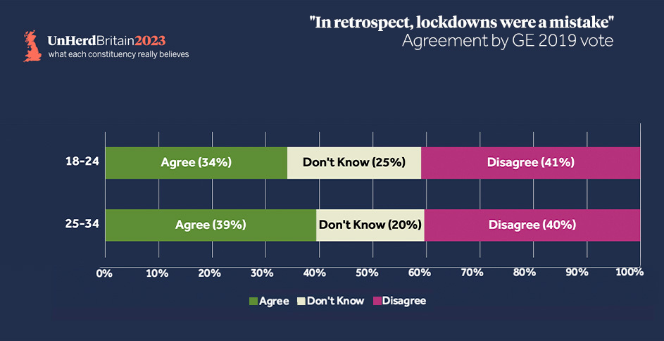 The UnHerd poll shows that 54% of people in the UK do not think, retrospectively, that lockdowns were a mistake, with almost a third (30%) still in strong support of them. Among those in my age group of 18-24, 41% disagree with the idea that the lockdowns were misguided, with 34% in agreement. In this respect they are more pro-lockdown than the 25-34 age bracket, where 39% think the policy was a mistake. This is worryingly compounded by a recent YouGov poll showing that over half (51%) of those aged 18-24 think that Government measures during the pandemic weren’t strict enough.