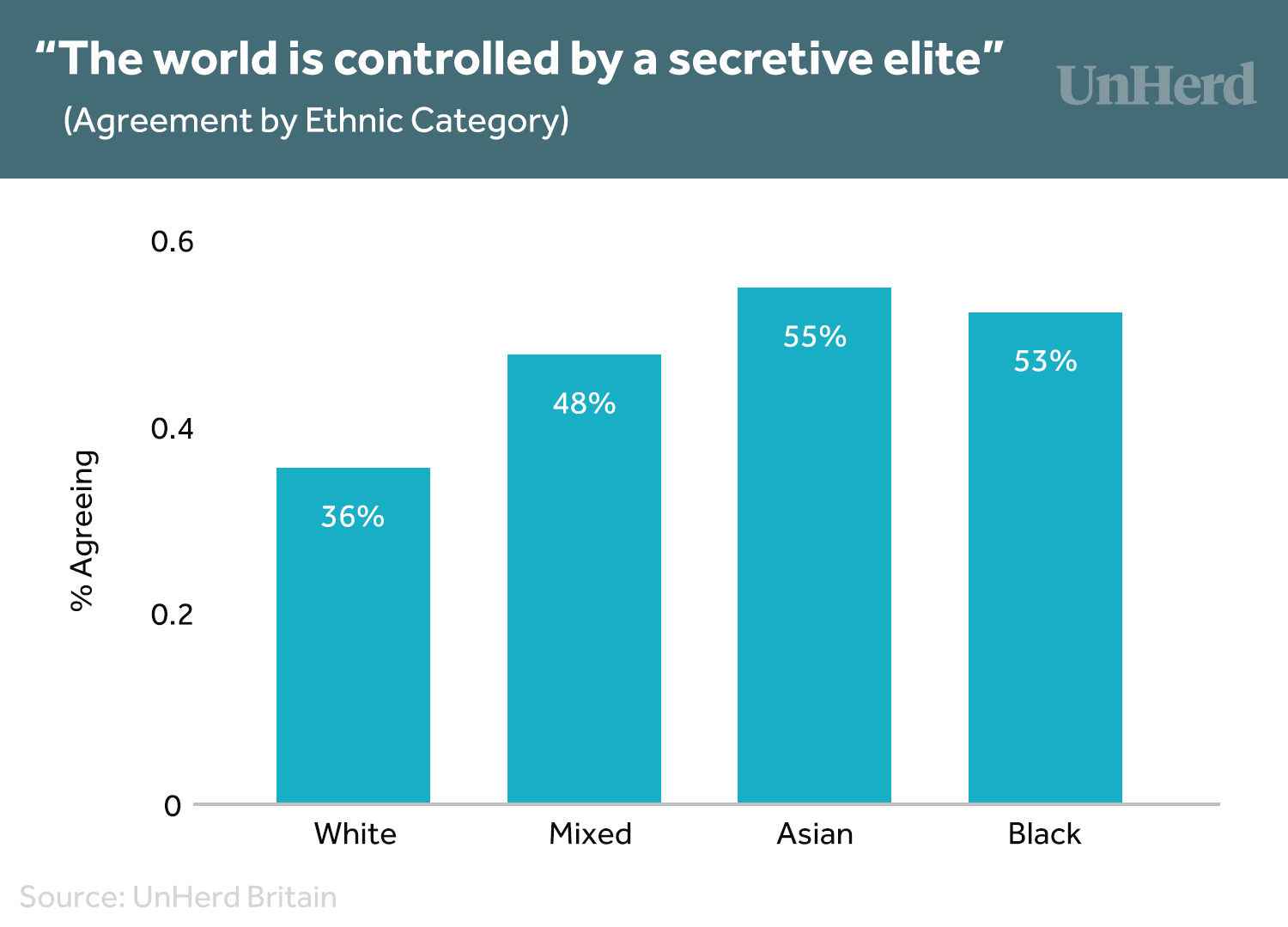 Freddie Sayers, drawing on UnHerd’s massive Focaldata survey, writes that more British people agree with the statement, ‘The world is controlled by a secretive elite,’ than disagree. Results show that Labour constituencies are somewhat more likely than Conservative ones to back this sentiment, but the strongest support for the statement, at 54%, is among 2019 Brexit Party supporters.