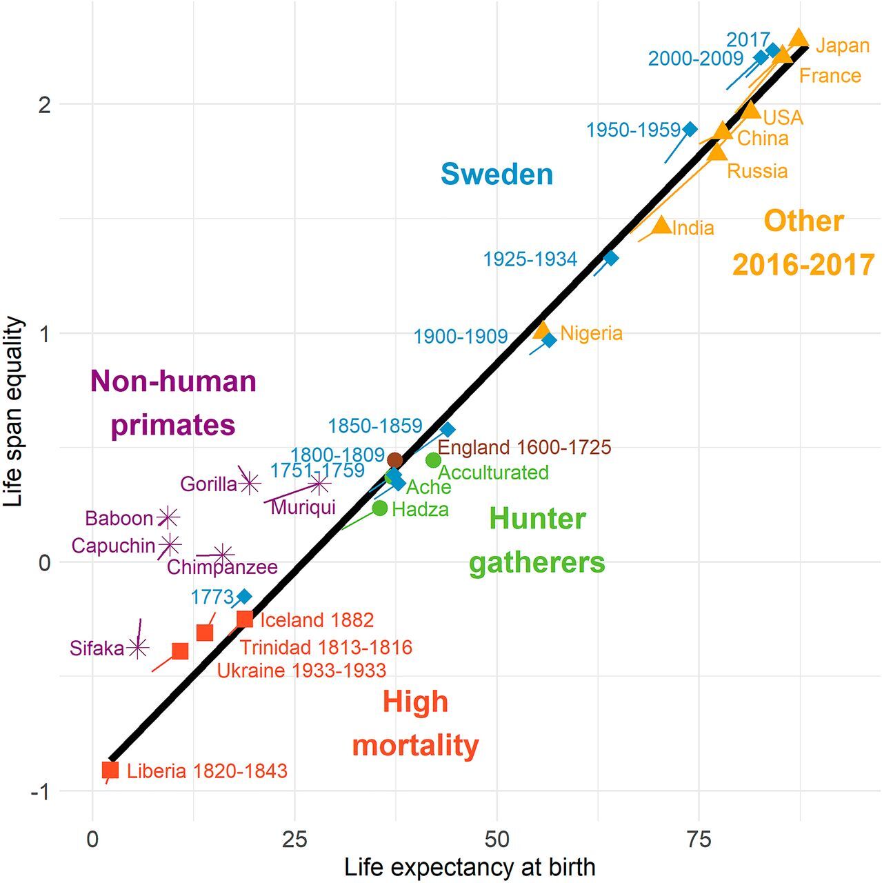 A hard limit to the maximum extant of extreme old age doesn’t mean that we won’t see merely very old age becoming the norm. Indeed, the authors show how that the increase in life expectancy at birth goes hand-in-hand with an increase in life span equality. In other words, everyone gets to share in the longevity dividend, not just the most privileged members of society.