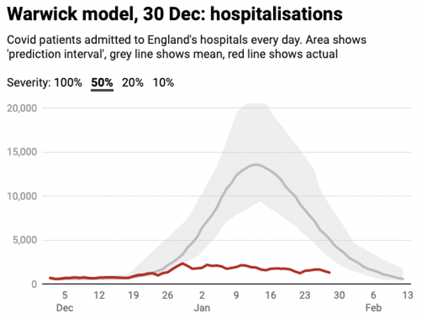 Compare that to Warwick University’s forecast of new daily hospitalisations, if we continued with ‘Plan B’ restrictions and didn’t impose any further lockdowns. The red line is what actually happened: