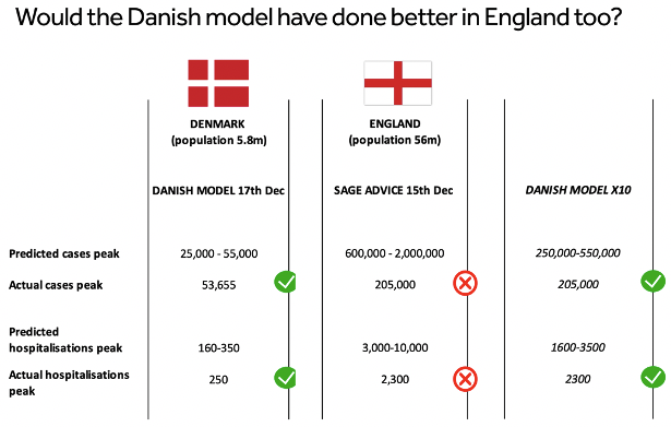 I did some back of the envelope calculations, and if we had had the Danish scientists in charge here in England, it looks like the estimates would have been a lot more accurate. Of course you can’t simply transpose these figures (and Denmark has had a higher Omicron surge than the UK) but it is a useful high-level exercise. The population of Denmark is 5.8m, while the population of England is 56m — almost exactly ten times the size. If you multiply the Danish forecasts by ten, you get a lot closer to what happened in England than the numbers put forward by the SAGE committee to our Government: