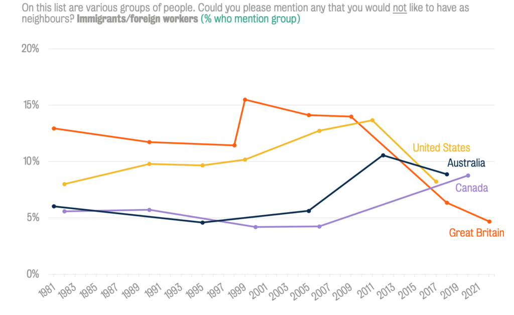 Britain has also come from behind to overtake the rest of the Anglosphere when it comes to racial tolerance. Since 1981, the United States has only gone down by five percentage points and Australia by two while Canada’s tolerance has, in the last forty years, actually risen, with a present-day figure of 4%.